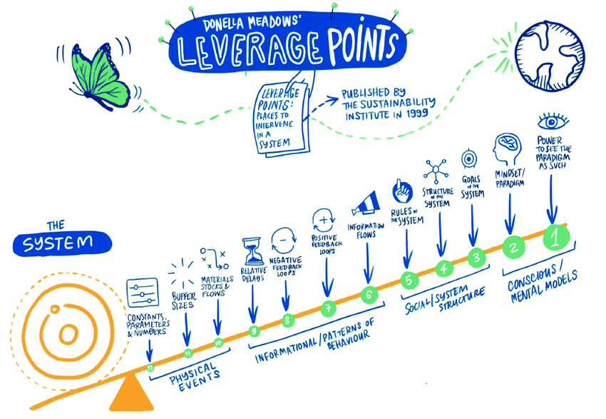 The idea is that to change the state of the system you need to impact one of those levers. Intervening at the bottom of the diagram (physical events) has little impact and can be potentially hard to do. Intervening at the top (mental models) has huge impact.